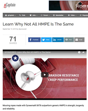 Dyneema® – the world’s strongest, highest-performing fiber – is very lightweight, durable, corrosion-resistant and hence ideal for offshore applications. Meantime, the well-respected, maritime-focused news site gCaptain offered an ideal channel to DSM Dyneema’s target audience for its “Feel Secure” messaging campaign that features use of the ultrahigh-molecular-weight polyethylene (UHMWPE) fiber in such applications as chains, netting and mooring ropes.